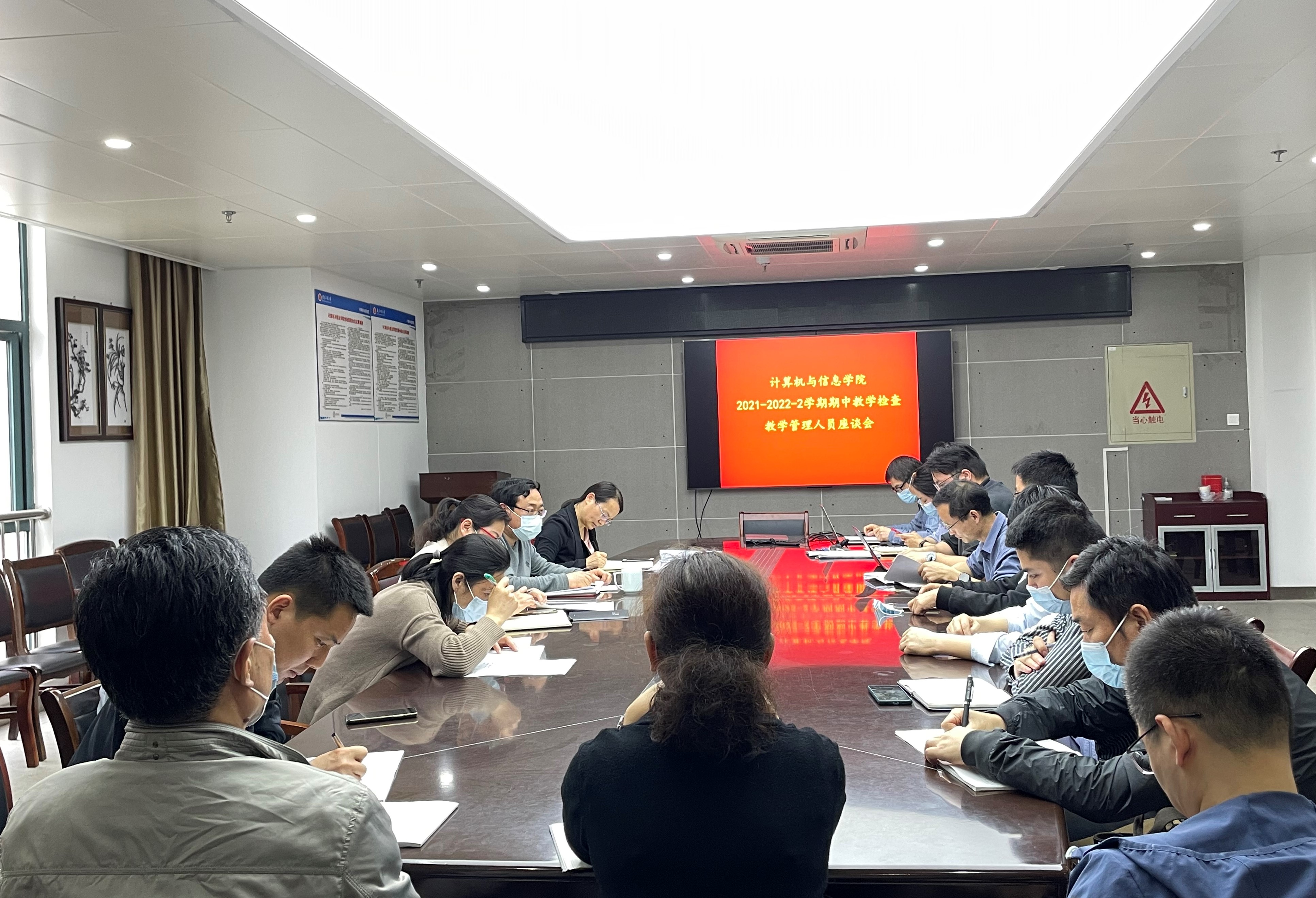 本网讯 为全面了解本学期课堂教学,促进教育教学质量和人才培养能力的全面提升,计算机与信息学院在前期学生座谈会、专业师生座谈会、系部教师座谈会的基础上,于4月27日在实验楼C座622召开期中教学管理人员座谈会。学院领导、系正/副主任、实验中心主任、创新创业教育中心主任、督导秘书、学工秘书、教学秘书、辅导员代表、教务员参加了座谈会,会议由副院长刘涛主持。