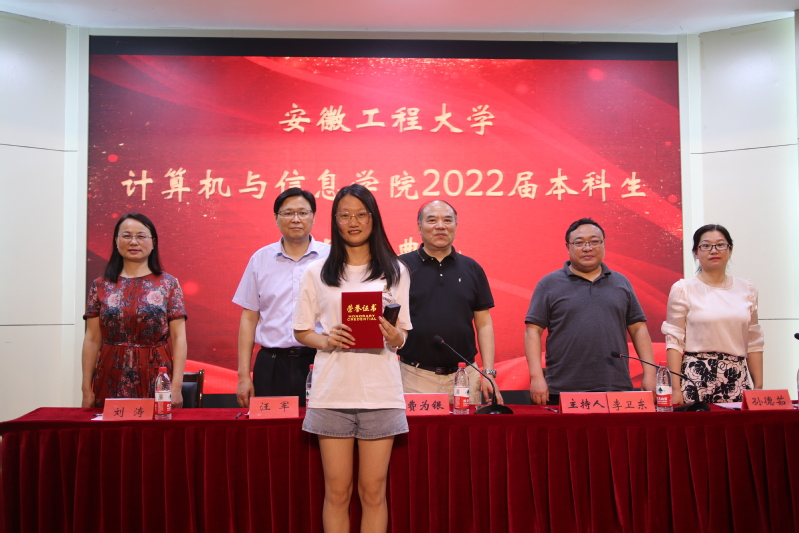 院党委副书记孙德茹宣读了2022年安徽省普通高等学校品学兼优毕业生和2022届优秀毕业生的名单。张盛超等14名毕业生被评为安徽省普通高等学校品学兼优毕业生,汪亚龙等20位同学被评为校2022届优秀毕业生。
