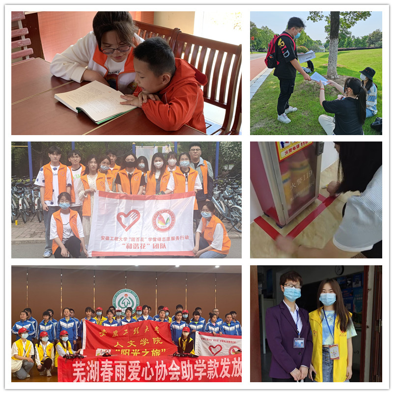 “风信子”团队于5月6日至8日在校园内开展志愿服务工作,为宿管阿姨送去温暖与祝福。5月8日,“风雨花”大学生法治宣讲志愿服务团队在人文学院分党校第二十九期积极分子培训班开展“青春五月”《劳动法》主题宣讲活动。5月15日上午,“山樱花”团队受芜湖盲校邀请参与“阳光助残日”活动,用行动关怀盲童,助力盲童工作。“飞燕草”团队走进乡村,与新希望社区工作者一起在陡沟镇裕兴村开展公益课堂志愿服务。“万年青”团队于5月22日在学校二食堂开展有关独居老人的调研。“木槿花”团队在校园里开展安全知识宣讲,为构筑校园消防防控屏障贡献自己的一份力量。