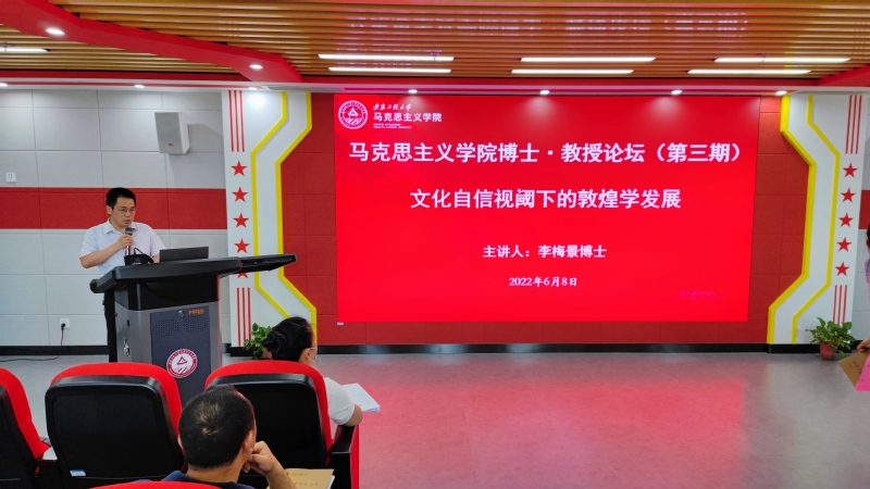 本网讯 6月8日下午,马克思主义学院第三期博士•教授论坛在VR虚拟实践教学中心举办。本场论坛邀请马克思主义学院陈金香博士和李梅景博士分别作题为《人德合一:中国个体道德的文化价值基础和构建目标》和《文化自信视阈下的敦煌学发展》的主题报告。马克思主义学院全体教师及研究生参加本场论坛,论坛由学院副院长李海涛主持。