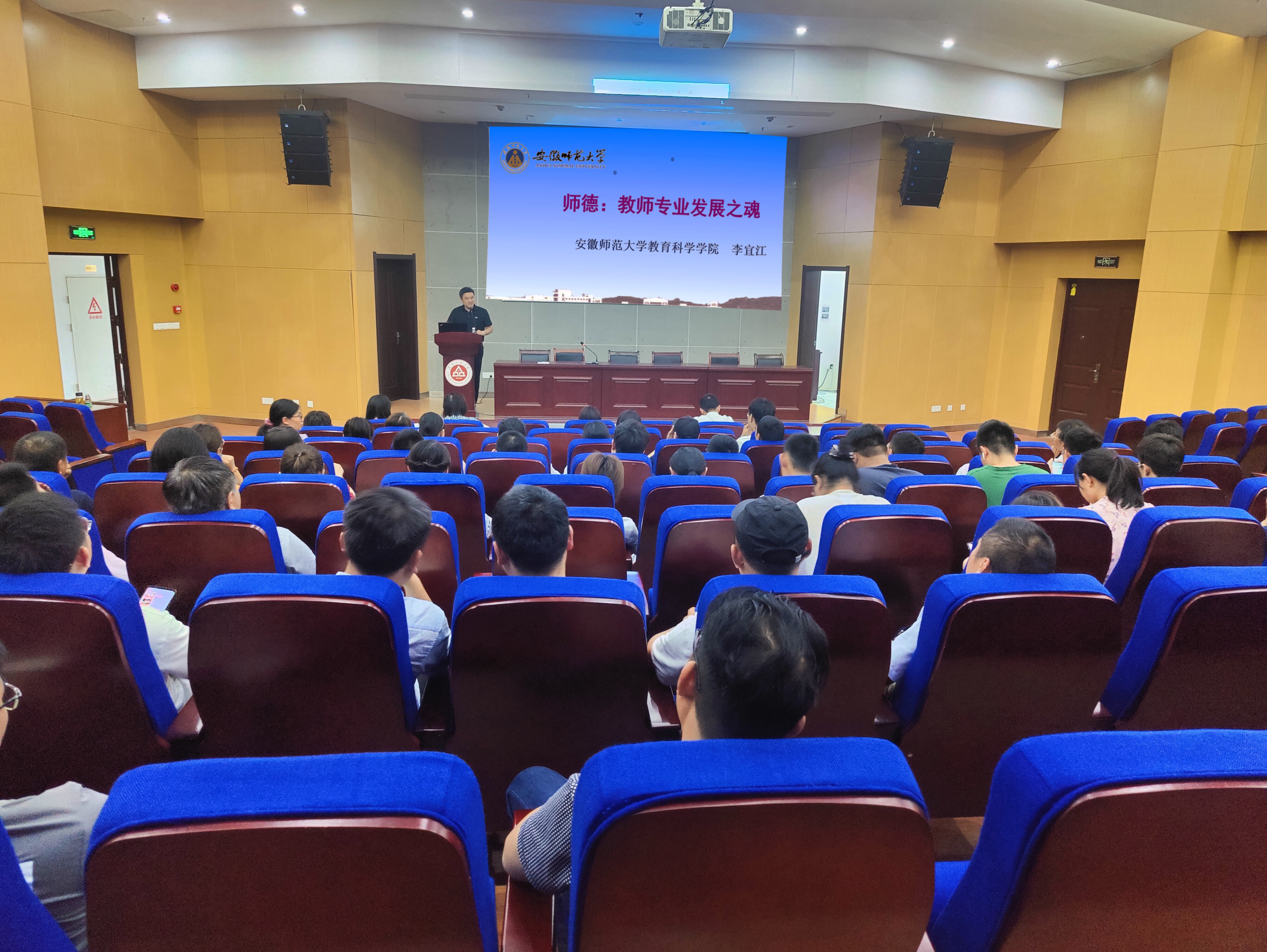 本网讯 为进一步贯彻党的教育方针,推进师德师风建设深入开展。6月22日,纺织服装学院邀请到安徽师范大学教育科学学院院长李宜江教授作“仁而爱人,甘为人梯”师德师风建设主题讲座。纺织服装学院党委副书记梁雪松、副院长徐珍珍,全体教职员工近80人参加讲座。讲座由梁雪松主持。