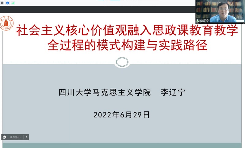 本次研讨会分两个阶段进行。会议第一阶段为主旨报告会,由李红星主持,李辽宁和王建华分别作主旨报告。李辽宁教授以《社会主义核心价值观融入思政课教育教学全过程的模式构建与实践路径》为主题,从“社会主义核心价值观的多维样态”“社会主义核心价值观融入思政课教育教学全过程的模式构建”“社会主义核心价值观融入思政课教育教学全过程的实践路径”三个方面进行了详细论述。他指出,社会主义核心价值观既是一种价值理念,也是一种理论体系、制度约束和行动指南,我们要通过理论灌输式、情感渗透式、制度规范式和活动体验式等方式将社会主义核心价值观融入思政课;社会主义核心价值观融入思政课全过程需要在加强顶层设计,聚焦关键环节,加强队伍建设和强化制度协同等方面持续用力。王建华基于对政党与现代国家的分析框架,论述了民初政党政治失败的原因及其军政、训政、宪政的困境,深入阐释了中国特色政党制度生成的理论与实践逻辑。他强调,回首百年中国特色政党制度生成的理论与实践逻辑,我们能够发现,中国特色政党制度是基于中国历史与中国社会发展的逻辑必然,现代化国家建设的任务推动中国政党制度的成长。