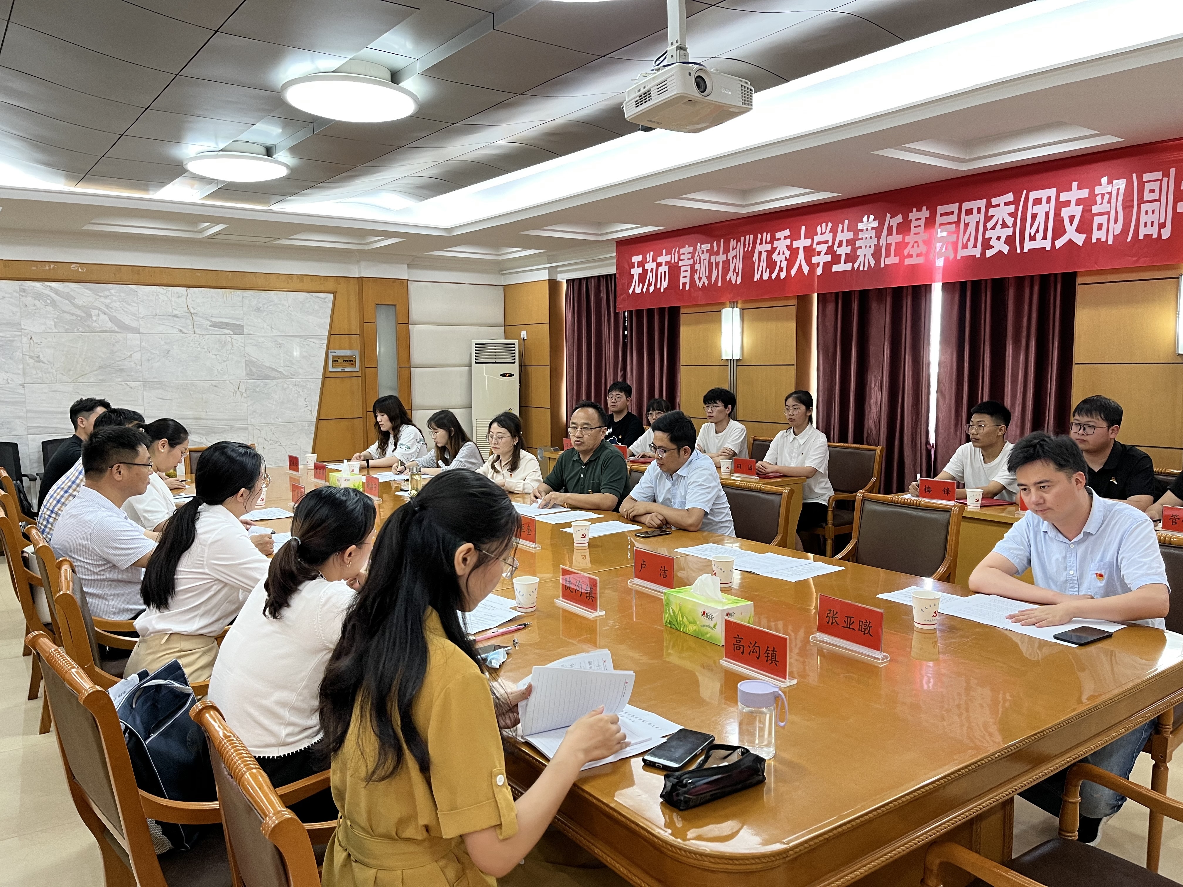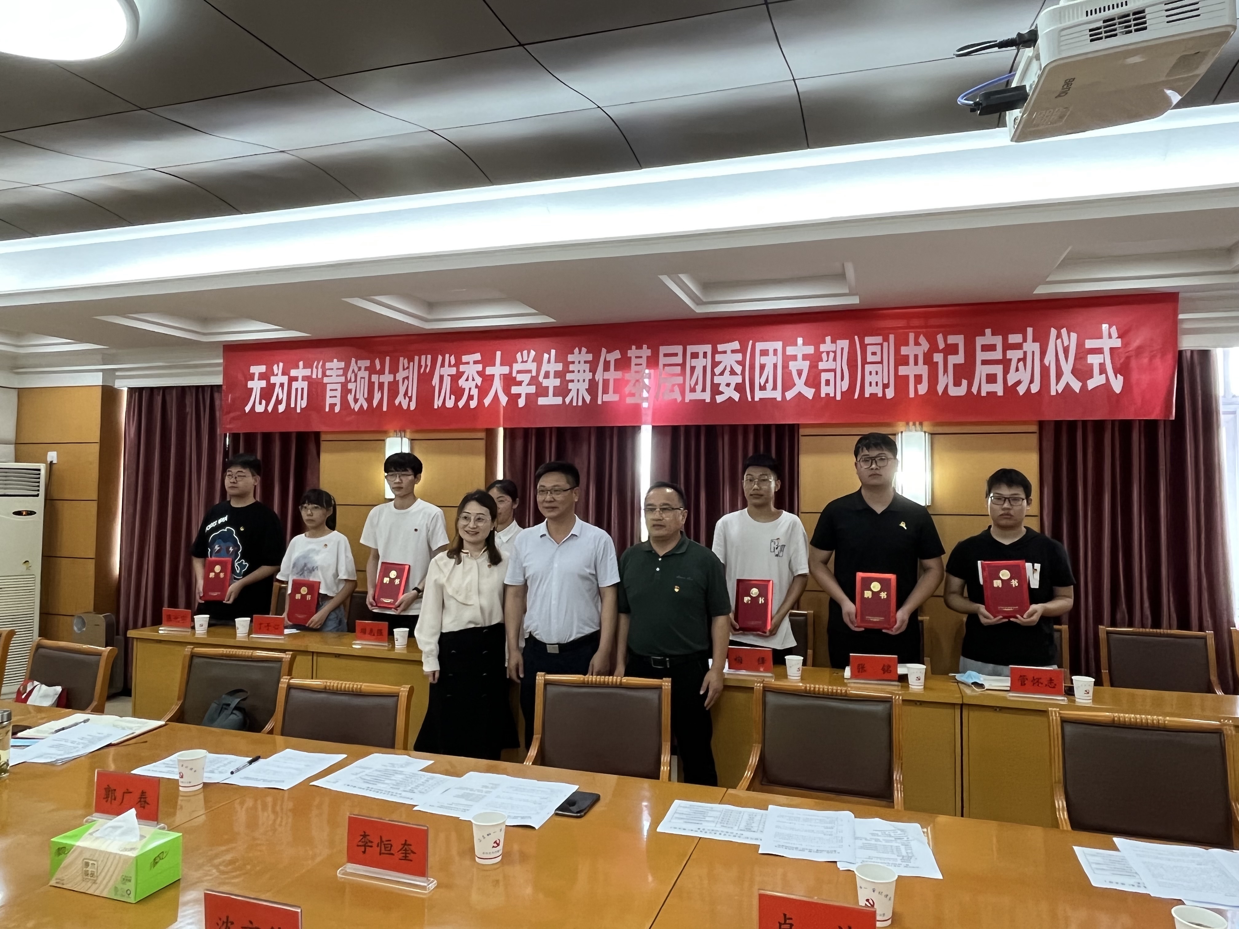 本网讯 6月30日,电气工程学院与无为市团委在无为市政府会议室举行“青领计划”启动仪式。团芜湖市委副书记谢翔宇,无为市组织部部长陈兆强,校团委书记郭广春、学院党委副书记李恒奎、学院和无为市团委有关同志以及选聘的7名优秀大学生出席仪式。
