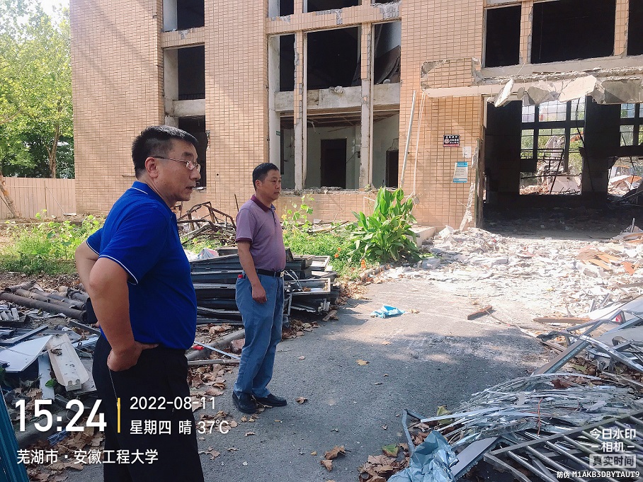 2022年8月10-11日,校党委书记张志宏、校党委常委、副校长郑健先后亲临一食堂拆除现场检查拆迁进度,就施工安全、疫情防控等方面提出了要求。