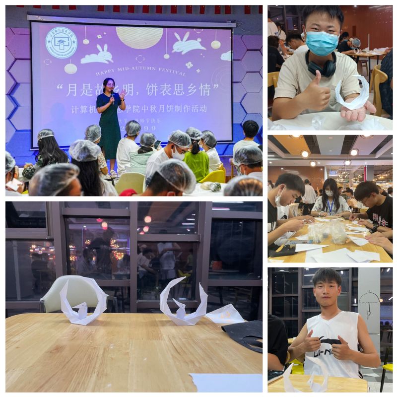 活动在学院精心布置的场地开展,包括手工包月饼、折纸和填写心愿。活动主持详细的向大家介绍了制作手工冰皮月饼的技巧和过程,同学们分成小组,在获得材料后便开始动手制作,进行包馅、收口、按压成型等步骤,经过一道道工序,一个个印有各式图案的月饼便新鲜出炉了,一个月饼一份情,每个月饼都浸透着美好的心意。当看到一个个漂亮的月饼从自己的手中完成时,每个人都感到兴奋和满足,同学们热情高涨、其乐融融,有的拿起月饼拍照留念,有的则品尝起亲手制作的劳动成果,忙得不亦乐乎,热情高涨。计算机222张金鹏表示,我今天来参加活动,就是想把亲手制作的月饼送给老师和学长导员,祝他们中秋节快乐、教师节快乐!同时通过实践活动,享受劳动乐趣,提升劳动技能。学院团委副书记表示,此次主题活动旨在弘扬传统文化、增进师生情谊、鼓励新生热爱劳动,充分发挥劳动教育树德、增智、强体、育美的综合育人价值。