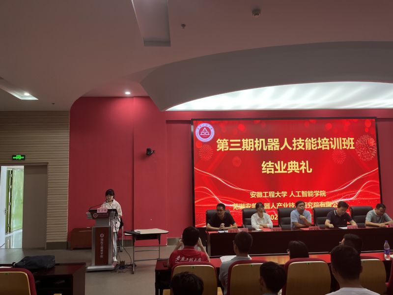 本网讯 9月17日上午,人工智能学院在国际工程师学院小报告厅举行第三期机器人技能培训班结业典礼。人工智能学院党委书记任家钱,党委副书记李文江,副院长江本赤,芜湖市工业机器人定点培训机构——芜湖安普机器人产业技术研究院有限公司工程师教育装备部副部长朱孟,智能制造工程系专业教师、辅导员、培训班全体学员,2022级机器人工程专业、智能制造工程专业全体新生参加。结业典礼由智能制造工程系主任刘玉飞主持。