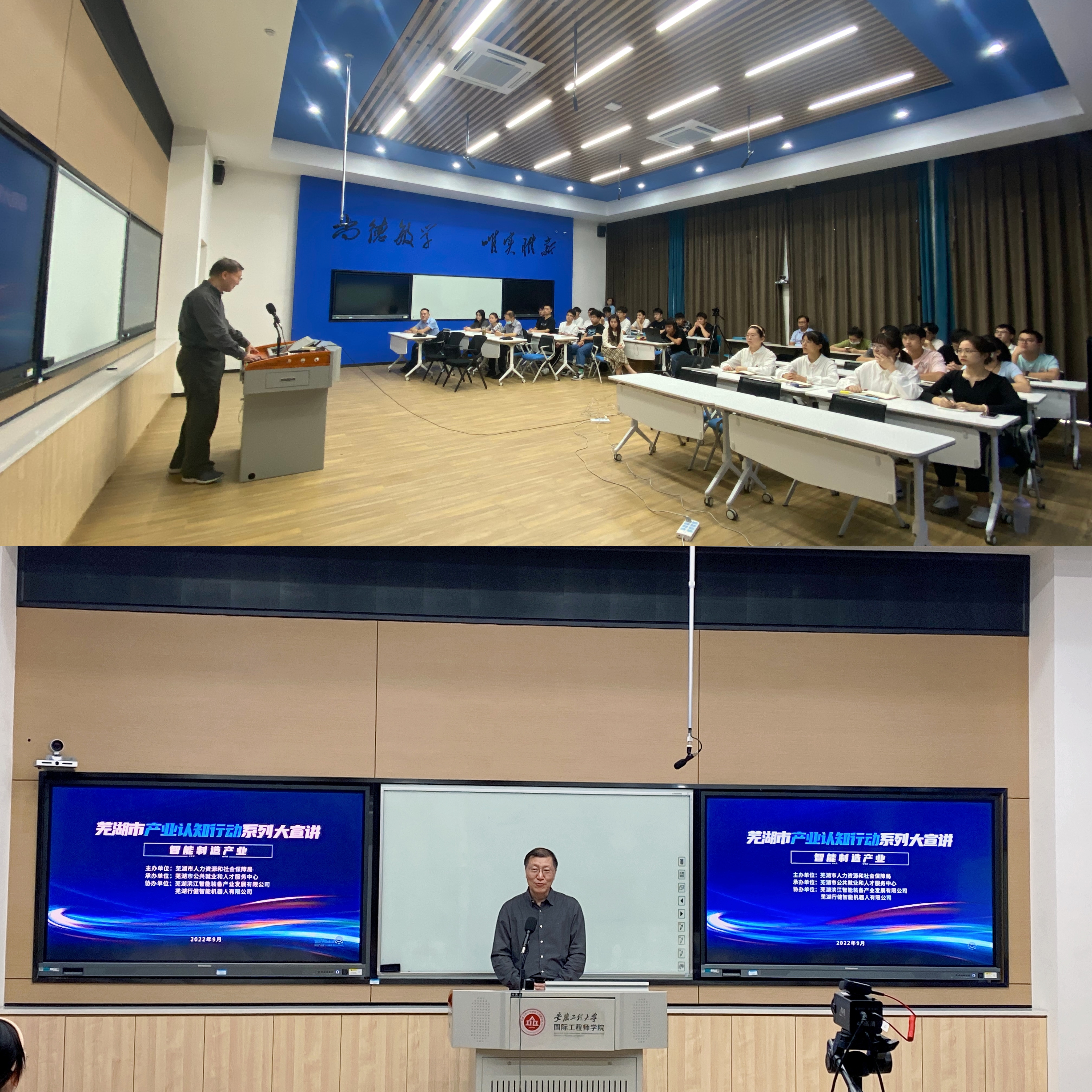 学院为提高学院毕业生就业质量,坚持走出去与引进来相结合。李恒奎带队赴宏景电子、安徽世福仪器等企业调研座谈,以“优势互补、资源共享、合作共赢”为理念,加强产学研协同创新,探索联合培养方式,全面推进在人才培养与学生实习就业等方面的合作。同时,学院充分发挥社会优质资源作用,积极聘请企业导师进校园为学生讲授产业发展、就业经验与技巧,让学生在学校实现与职场的零距离。9月20日下午,在国际工程师学院1楼智慧教室,学院联合芜湖市人社局开展智能制造产业认知职业前沿直播会,会议邀请芜湖行健智能机器人有限公司董事长王宗义教授介绍智能装备产业现状、发展前景,并对有志于到智能装备产业就业的同学给予了指导。