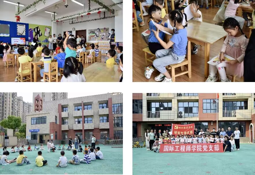 9月23日下午,纺织服装学院研究生党支部成员与国际工程师学院党支部成员在安徽工程大学附属幼儿园将印制带有红色图案以及传统文化的手帕赠送给幼儿园小朋友们;纺织服装学院党支部成员向小朋友们进行PPT演讲,介绍印染小知识,并播放数码印花视频,让他们了解图案印制的有趣过程,带领小朋友们感受科学魅力;随后播放“王二小放牛”动画等短片,让小朋友了解现在幸福生活的来之不易,宣传红色精神及传统文化精神;最后,双方支部党员与小朋友们开展击鼓传“花”游戏。