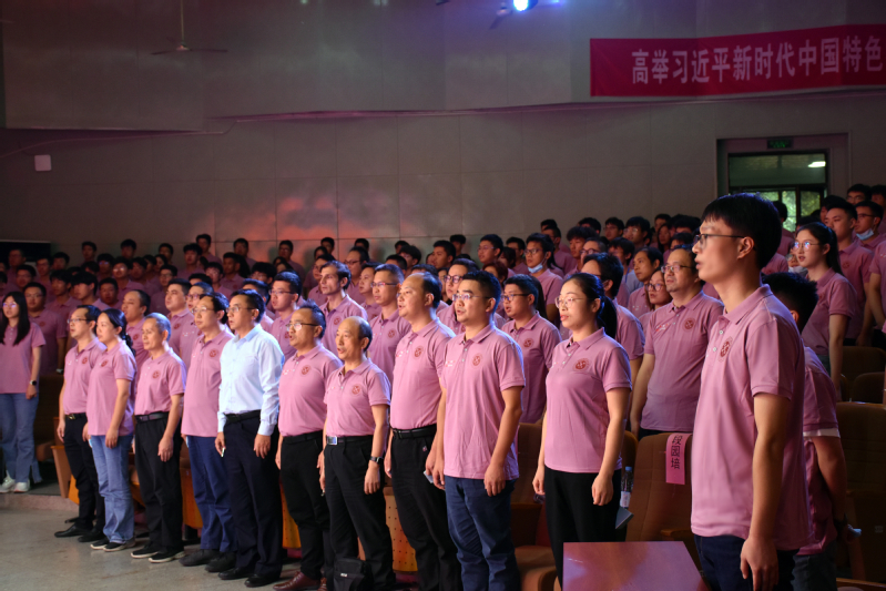 大会开始前,现场全体师生起立,齐唱国歌,共同庆祝即将到来的新中国成立73周年。