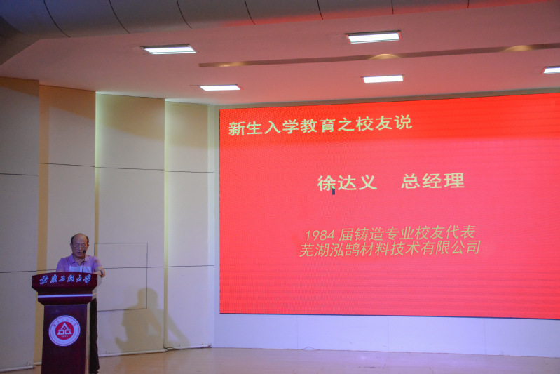 1984届铸造专业校友、芜湖泓鹄材料技术有限公司总经理徐达义饱含深情地发言,他深情回顾42年前入校以来的成长发展历程,寄语2022级新生:既要学会“为学”,更要学会“为人”,懂得“感恩”。“我做学生时的梦想,就是成为一名工程师,如今我已实现了自已的梦想。这一生的经历使我深刻的体会到:个人命运只有与祖国的命运、与时代的发展结合起来,才能更精彩,更有意义!我愿借此机会,寄语在座的每一位同学,希望你们早立志、立大志,珍惜美好青春年华,刻苦学习,努力掌握本领,早日成为建设祖国的栋樑之材。”