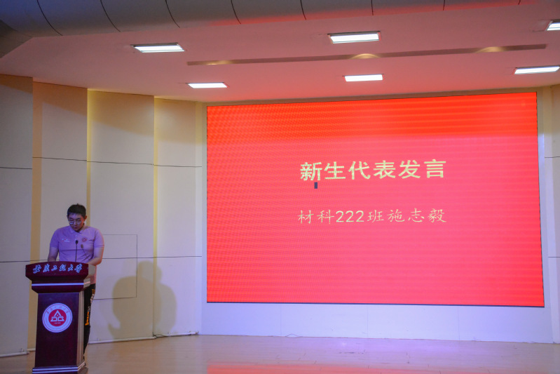 新生代表、材科222班施志毅同学在发言中认为,奋斗是青春最佳答卷,他向2022级新生发出倡议:铭记“尚德敏学 唯实惟新”的校训,在今后的学习生活中锐意进取,砥砺前行,在为材料科学与工程学院更好发展添光添彩中绽放青春、再创辉煌。