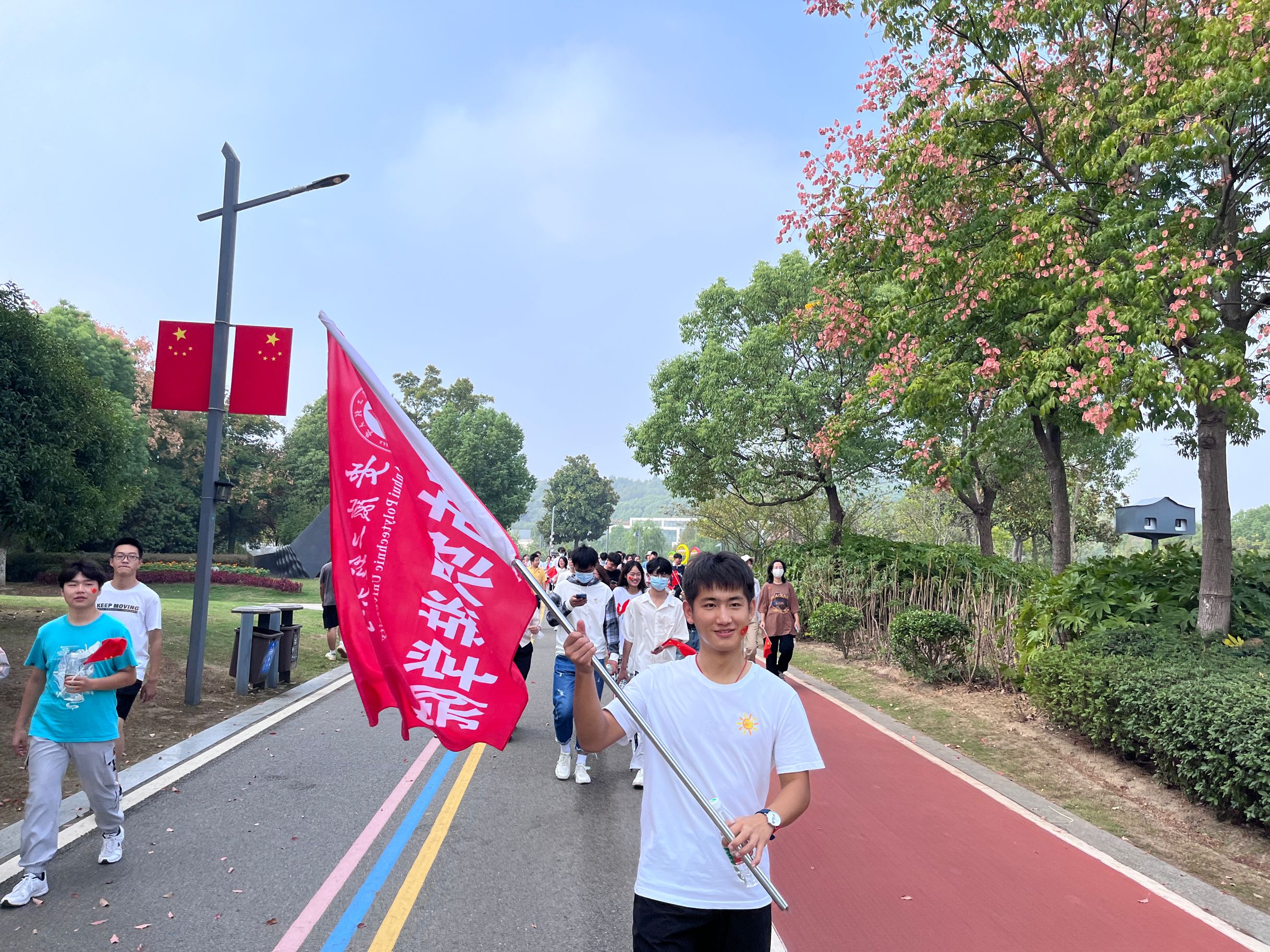在学院党委、团委相关老师的带领下,同学们手握国旗,齐聚雕塑公园南门。随着一声“出发”号令,大家从南门出发沿着公园标志性建筑一路打卡回到终点。一路上,同学们欢声笑语,相互鼓励,徒步过程中无人掉队、乱丢垃圾等现象,充分展现了大学生斗志昂扬、奋发有为、蓬勃向上的良好精神风貌。活动结束后,同学们有序回到学校,按规定归还活动相关物品。