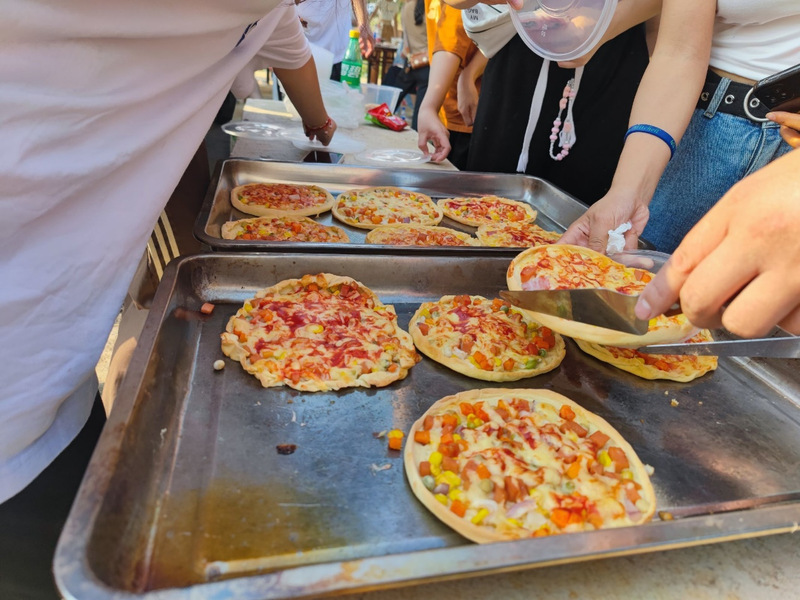 结束学习参观后,同学们转车来到天源时光创意劳动教育营地,体验披萨制作和绘制彩石。在营地老师的指导下,从发面、和面、揉面、馅料调制到制作成品;从石料挑选、颜色调配到绘制成画,所有工序都由同学们亲自动手完成。一块块小小的圆形披萨包含了老师、同学们对生活的热爱;一个个五颜六色的彩石描绘出大家不同的内心世界和对祖国母亲的美好祝愿。