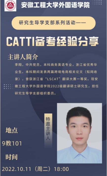 本网讯 为贯彻落实学校党委“三抓”和“三全六专”育人工作要求,发挥榜样引领和党员示范作用,让学生“学”起来,帮助翻译研究生同学备考CATTI二级,研究生导学支部于10月11日晚举办了CATTI二级备考经验线上分享会。研究生导学支部书记李新国、学院硕点负责人张凤梅老师参加了本次会议。