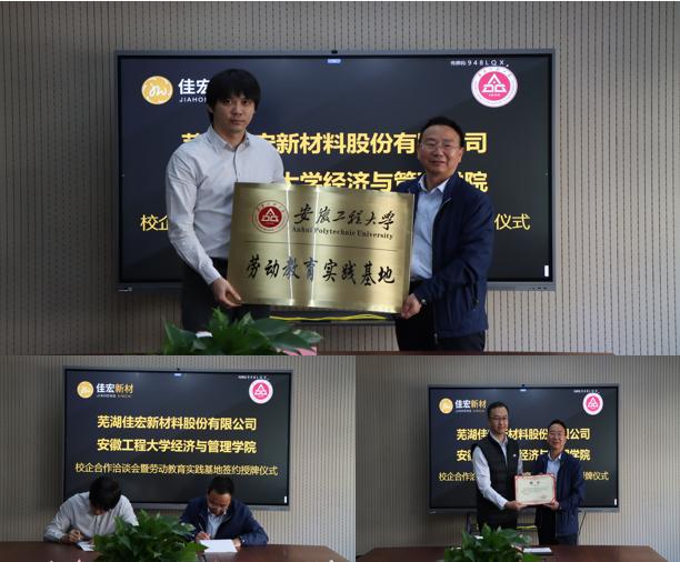 本网讯 10月13日,经济与管理学院院长龚本刚一行4人赴芜湖佳宏新材料股份有限公司积极开展访企拓岗促就业专项行动,通过实地走访企业建立就业合作渠道,并举行劳动教育实践基地签约暨授牌仪式。