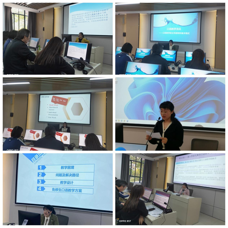 在口语教学沙龙阶段,根据由理论到实践,用教学理论指导教学实践的思路,崔媛媛、喻晓静两位老师梳理了大学英语口语教学文献、口语教学的主导原则和基本模式;王金凤、涂文婷两位老师介绍了本学期大学英语两个教学部所承担的大学英语1、大学英语3两门课程的口语教学设计;杨晓丽和袁学琴两位老师从大学英语AI教学和基础英语特色课程方面探讨了口语教学的模式与实践。六位老师的交流报告内容精彩,广大教职工表示受益匪浅,对于提高口语教学水平有重要借鉴作用。