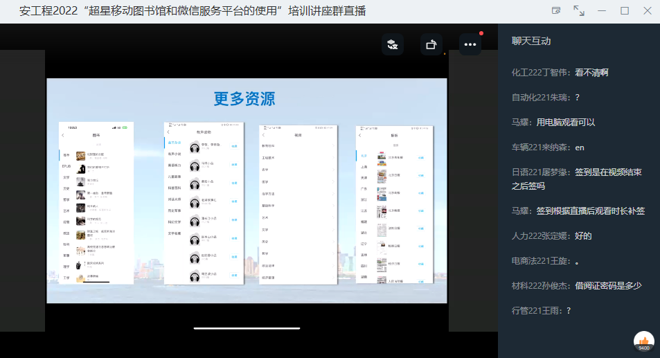 本网讯 10月19日,图书馆特邀超星教育集团培训讲师王雅培以线上直播方式为大家做“随时随地的知识获取,微信时代的移动阅读——超星移动图书馆和微信服务平台的使用” 培训讲座。校本部和国际工程师学院有160多名学生参加了此次讲座。
