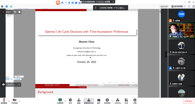 陈树敏副教授做了题为《Optimal Life Cycle Decisions with Time-Inconsistent Preferences》的报告。这项研究在平稳马尔可夫完美均衡框架下明确地得到了最优时间一致策略。研究发现,投资者立即增加消费以寻求快速满足。此外,在生命周期的后期,财富积累效应占主导地位,消费和人寿保险购买较低。