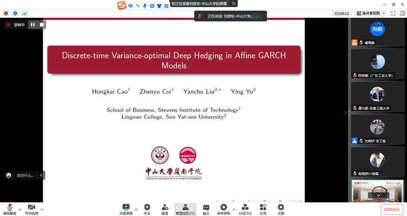 刘彦初副教授做了题为《Discrete-time Variance-optimal Deep Hedging in Affine GARCH Models》的报告。这项研究采用半显式和深度学习的方法解决了仿射GARCH模型的方差-最优对冲问题,采用拉普拉斯变换方法,导出了方差-最优对冲策略和初始禀赋的半显式公式,采用长短期记忆(LSTM)循环神经网络(RNN)体系结构求解了具有交易成本的均方误差损失函数下的最优套期保值策略。数值例子说明了不同方法、期权样式、套期保值频率和交易成本下的套期保值效果。