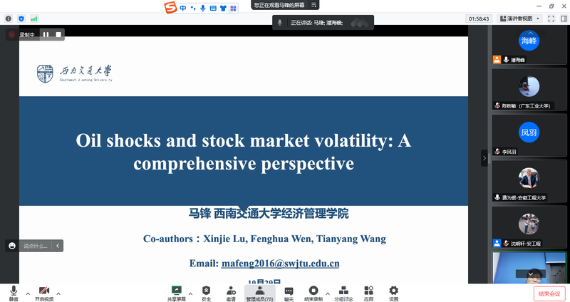 马锋副教授做了题为《Oil Shocks and Stock Market Volatility: A Comprehensive Perspective》的报告。从综合角度研究了石油冲击对股票市场波动的可预测性。实证分析表明,除了传统的经济变量和不确定性指标外,多种石油冲击测度还包含了预测股市波动的有价值信息。此外,最小绝对收缩和选择算子(LASSO)方法和机制转换模型共同实现了统计和经济角度预测精度的提高。在不同经济周期和市场条件(包括COVID-19大流行)下的稳健性检验证实了这些结果。