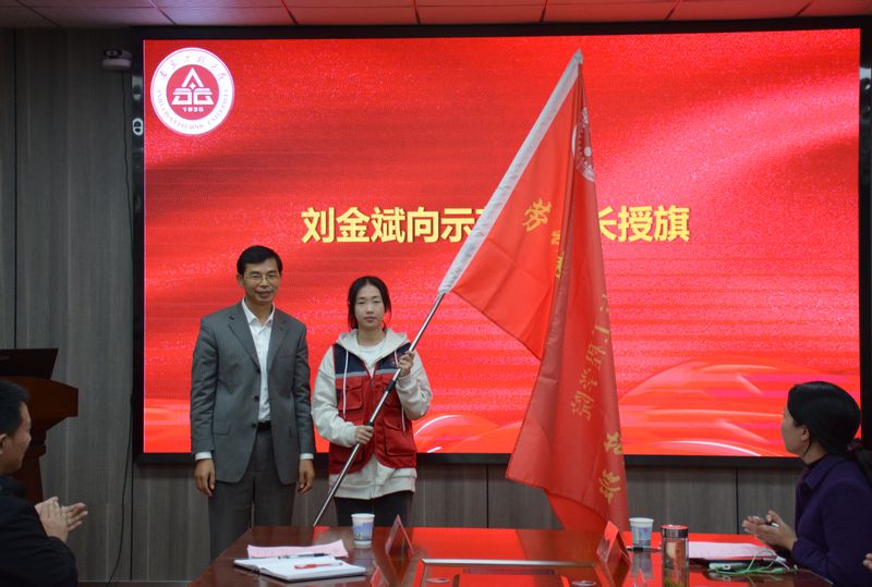 刘金斌向第一期劳动教育先锋示范班班长授旗。