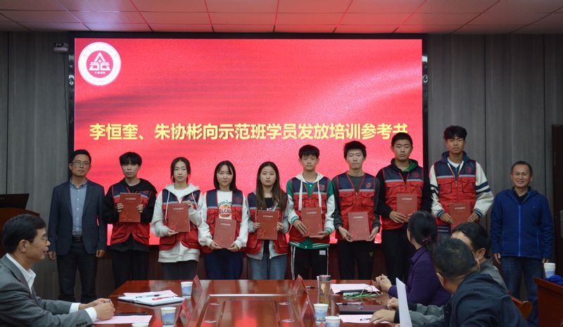 李恒奎、朱协彬向第一期劳动教育先锋示范班学员颁发劳动教育学习培训参考书。