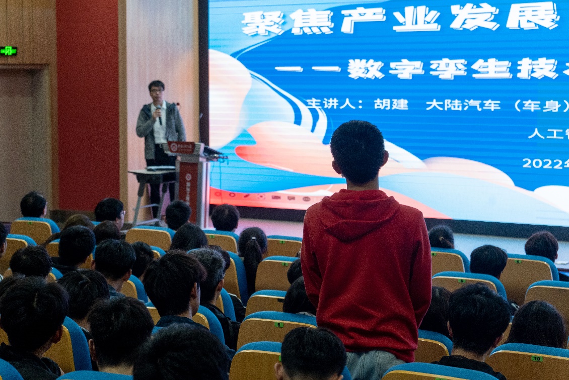 本网讯 为贯彻落实“三全六专”工作要求,提升大学生专业能力,加强大学生对专业前沿技术的了解,引导学生树立正确就业观,11月3日,人工智能学院特邀校友大陆汽车(车身)电子芜湖有限公司软件运营工程师胡建,来校开展校友创业报告会。报告会的主题为“聚焦产业发展,助力创新创业——数字孪生技术在智能制造中应用”,学院党委副书记李文江、副院长江本赤、阚宏林老师、大陆汽车(车身)电子芜湖有限公司软件运营组和测试组经理夏坤、HR强玉凤以及人工智能学院200余名本科生参加报告会。报告会由学院副院长江本赤主持。