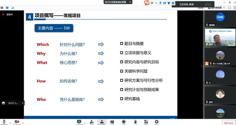 唐漾教授具有丰富的国家基金申报经验,他主持了国家自然科学基金重点项目、国家科技部重点研发计划项目、人工智能基础研究应急管理项目(重点项目)、中德科学中心合作交流项目,以及自然科学基金面上项目等国家级基金项目。在经验交流会上,唐教授从项目经历、现状分析、基金选题和项目撰写等方面介绍了国家自然科学基金的申请体会。系统分析了常见的申报失败原因,指出基金选题应注意 “鼓励探索,突出原则”“聚焦前沿,独辟蹊径”“需求牵引,突破瓶颈”“共性导向,交叉融通”等要素,注重多学科交叉融合。他强调一份好基金申报书应当具备基础性、科学性、可行性和前沿性四大特点。针对项目撰写,从针对什么问题(Which)、为什么做(Why)、核心思想(What)、如何去做(How)、凭什么是我做(Who)等“5个W”出发,进行了详细阐释和分享。分享结束后,参会老师们就如何写好申报书的各部分内容以及各自在申报过程中遇到的实际问题进行了交流。