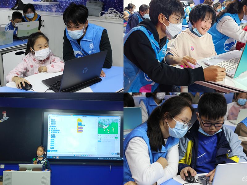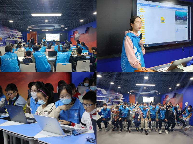 11月12日,志愿者实践中心服务团队前往芜湖市科技馆开展少儿编程科普活动,激发小学生的创造热情和创造活力,培养逻辑思维、计算思维和创造性思维,提升综合学习能力。前期志愿者们提前开展相关培训,了解少儿编程的内容和方式,掌握少儿编程的教授方法和授课特点。活动现场,志愿者通过编程语言向前来听课的小朋友们展示了少儿编程软件的运行方式,用电脑语言实现了小鱼的游动和小兔子蹦跳。通过志愿者的耐心教导,小朋友们全心投入,沉浸在编程的世界中,感受着编程语言的魅力,通过自己动手一步步拼接代码,让小动物动起来,让自己乐起来。活动最后,小朋友们一一上台展示了自己的编程成果。