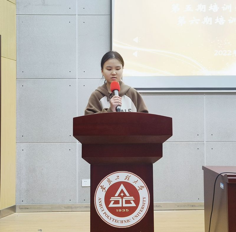 第六期班主任孙力力宣读了考核制度,强调了纪律要求,重点介绍了第六期培训班的学习安排。第六届培训班学员代表软件212潘静茹上台发言,她说作为新时代大学生,要坚定理想信念、做有理想、敢担当、能吃苦、肯奋斗的新时代好青年。她代表第六期全体学员做出郑重承诺,会加强理论学习,把深入学习习近平新时代中国特色社会主义思想这一马克思主义中国化的最新理论成果作为本次“青马班”学习的重中之重。