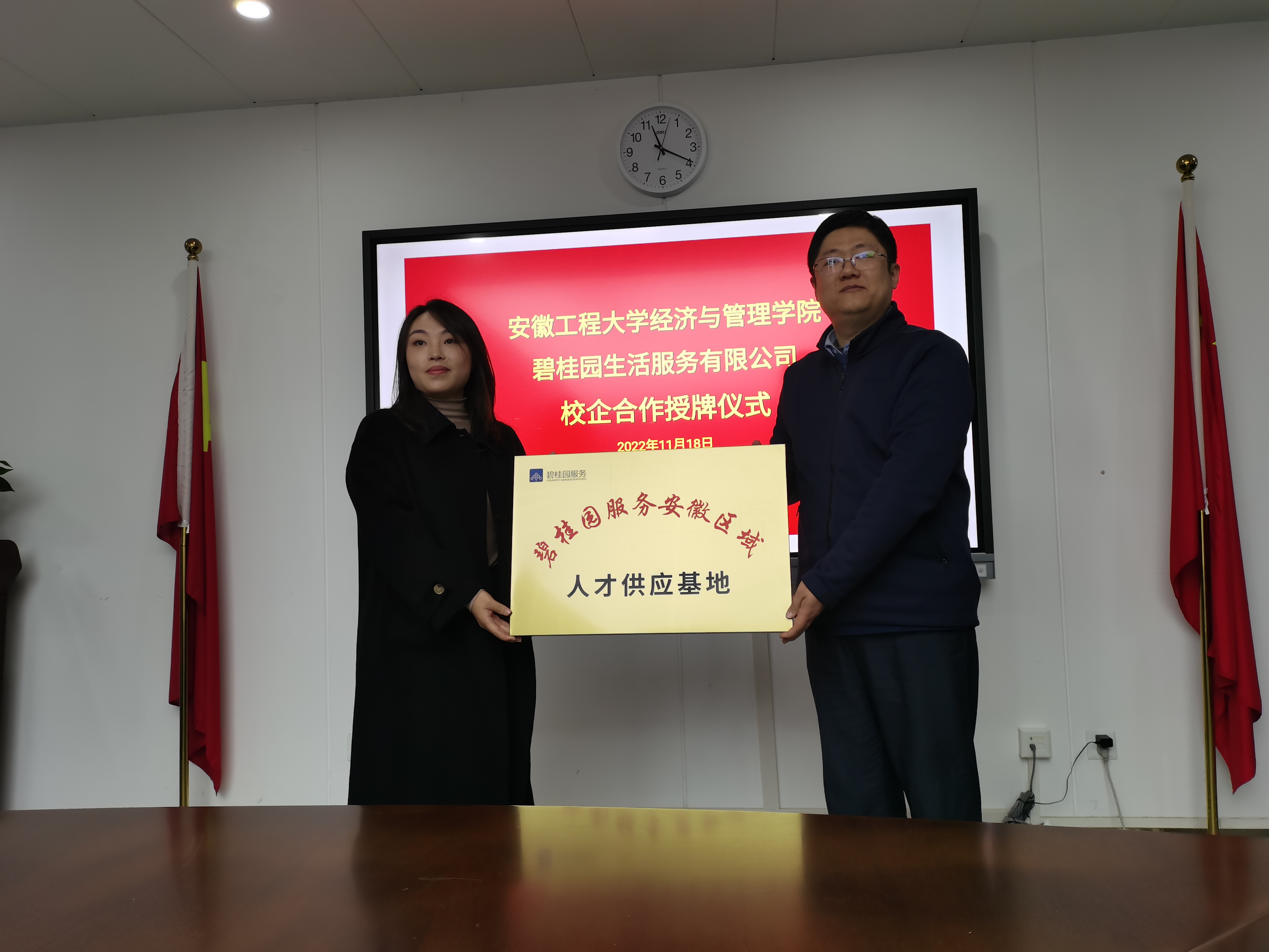 本网讯 11月18日,经济与管理学院与碧桂园服务有限公司(安徽区)联合授牌仪式在C座818会议室举行。碧桂园服务安徽区域人力资源总监钟长征、安徽区域品质经理甘国琴、芜湖片区高级经理陈金龙、安徽区域人力资源经理朱圆圆、皖东南城市公司人力资源经理周佳晨及有关工作人员出席了授牌仪式。经济与管理学院党委书记水心宝、党委副书记刘海涛、全体辅导员、教师代表共同参加。授牌仪式由刘海涛主持。