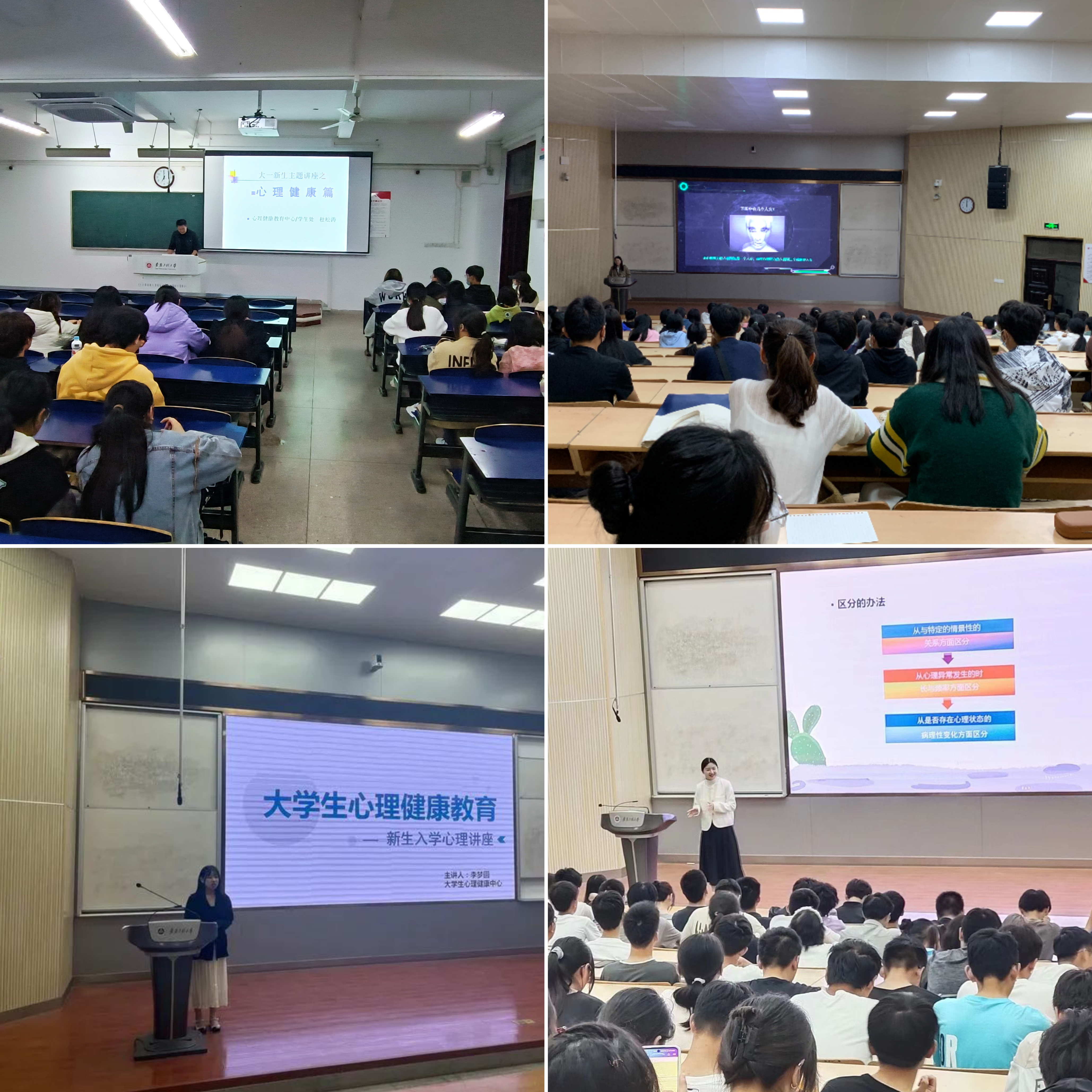 截至目前,共开展了11场新生入学适应心理讲座。讲座内容丰富、涵盖面广,主题包括“不忘初心,勇敢前行”“从‘心’出发,聆听心声”“新起航,‘心’出发”“逐梦未来,从‘心’开始”等,涉及大学生心理健康、角色转变、适应提升、人际交往调适、情绪调节、心理问题求助途径等贴近大学生活的内容,各位老师结合自己丰富的教学和心理咨询经验,以生活实例、错觉图片等多种形式切入话题,通过幽默生动地解读案例,穿插正念冥想、心理游戏等互动活动,寓教于乐,帮助新生们在轻松的课堂氛围中树立正确的心理健康观念和心理求助意识,鼓励同学们在心理学理论指导下探索适合自己的应对策略和方法,知悉心理健康教育中心的地址及预约方式,在需要的时候及时进行心理求助,帮助大一新生更好地适应大学生活。