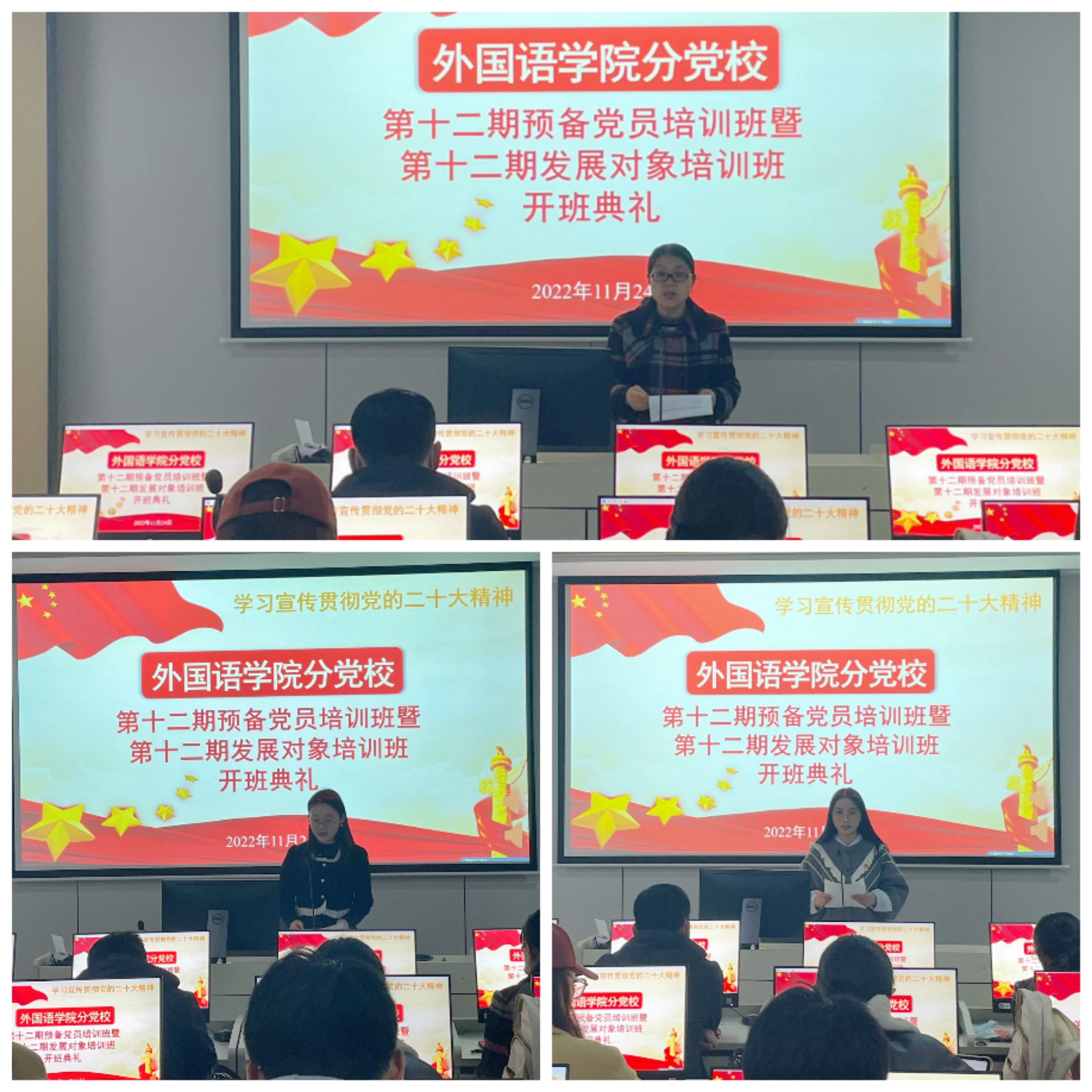本网讯 为深入学习宣传贯彻党的二十大精神,落实“三抓”和“三全六专”工作要求,11月24日,外国语学院分党校在9教103举办第十二期预备党员培训班暨第十二期发展对象培训班开班典礼。学院党委书记董金权、学院党委副书记李校林、辅导员以及培训班学员共60余人参加了线下开班仪式,培训班班主任张君及部分因疫情原因不能到达现场的学员通过腾讯会议APP线上参加了开班仪式。