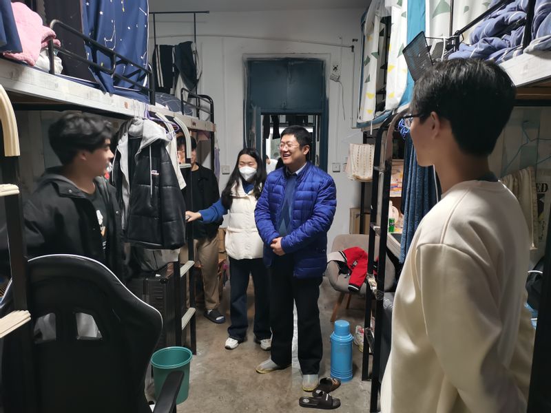 11月25日,学院党委书记水心宝、党委副书记刘海涛带领全体辅导员走访学生寝室。水心宝一行首先走访了男22#2019级、2021级男生寝室。走访过程中,水心宝详细查看了寝室卫生、用电安全等情况,叮嘱大家理解并认真遵守学校疫情防控规定,注意个人防护、做好个人卫生和寝室消毒通风等工作,还就校园电瓶车骑行等安全问题多次嘱咐。同时,水心宝结合学习宣传贯彻党的二十大精神,与各专业同学促膝长谈,引导青年大学生要坚定不移听党话、跟党走,怀抱梦想又脚踏实地,敢想敢为又善作善成,立志做有理想、敢担当、能吃苦、肯奋斗的新时代好青年。