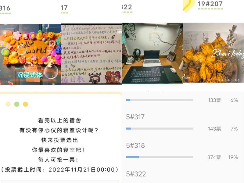 自大赛发布以来,共吸引20多个新生寝室报名参加,大赛以“设计与创意”为主题,在寝室设计中充分挖掘宿舍文化内涵,以“安全、整洁、温馨、环保”为目标,号召同学们充分发挥创造力,通过寝室成员共同的努力,对宿舍室内环境进行设计、布置,用心创造良好的生活环境。从天花板到地面、从墙头到床沿,同学们用心点缀出一个个舒适的生活空间,展现出大学生积极乐观的精神风貌。