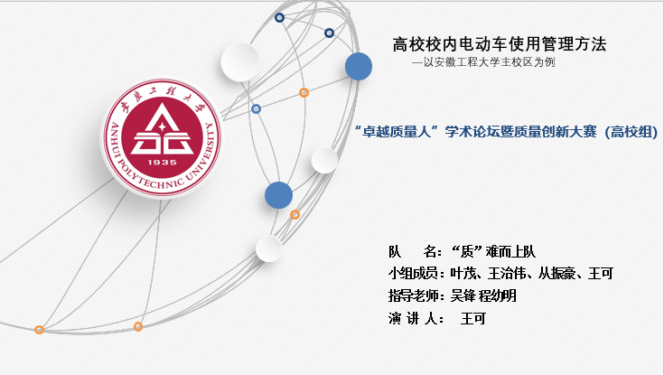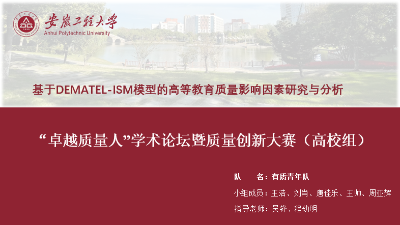 本次大赛旨在营造质量创新氛围,传播质量前沿理论,交流质量管理实践,推进质量文化建设,增强质量意识,储备质量人才。决赛分为主题报告及质量创新大赛两个阶段,通过线上方式进行,共计5000多人次观看了线上直播。参会人员为国内质量领域专家、学者和质量工作者,企业中高层管理人员、质量管理工作者,高校相关专业的师生等。我校参赛的2支队伍,有质青年队(王浩、刘肖、唐佳乐、王帅和周亚辉)和质难而上队(叶茂、王治伟、王可和从振豪),分别以“基于DEMATEL-ISM模型的高等教育质量影响因素研究与分析”和“高校校内电动车管理使用方法”项目参赛,在全国众多高校质量管理工程专业参赛队伍中获得全国一等奖和二等奖佳绩。