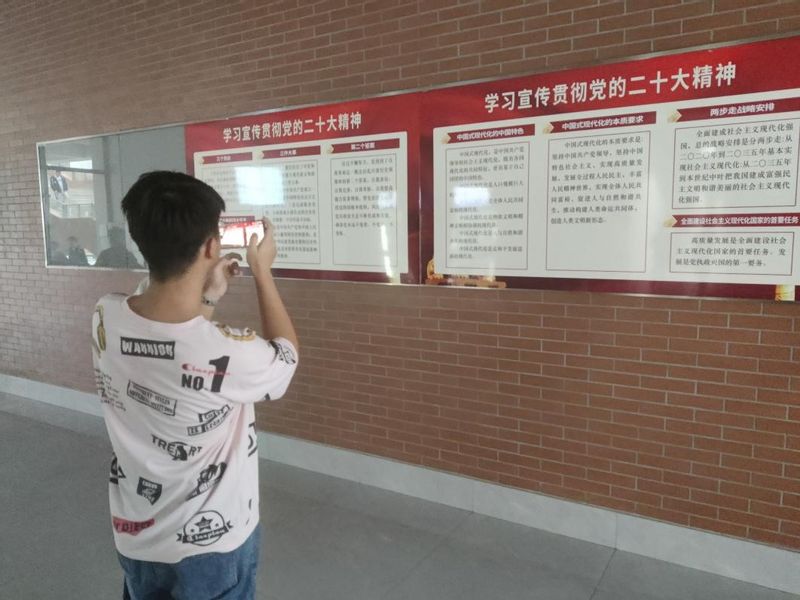 人工智能212团支部开展了学习党的二十大精神校园循迹活动,同学们通过寻找并拍摄校园中宣传党的二十大精神的墙报、标语和展板,对党的二十大报告主题、过去五年和新时代十年的伟大变革、新时代新征程中国共产党的使命任务有了进一步的了解。