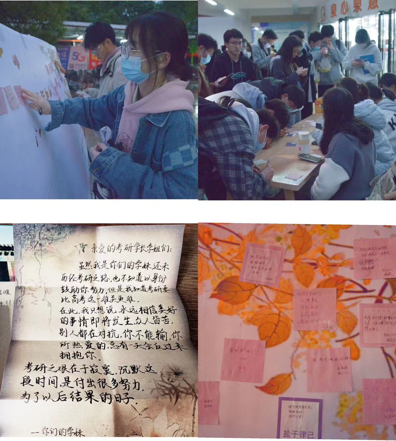 每到一处,学院领导们细心询问学生考研备战、求职面试的准备情况,耐心解答同学们考研就业的疑惑和困难,为考研学生送上“金榜题名”暖心大礼包,为求职同学送上“大鹏展翅”求职大礼包,预祝考研学子们一战成硕、求职同学们前程似锦。前期学院团委组织开展“情系考研生,研途送温暖”活动,鼓励同学们在卡片上写上对学长学姐温暖的祝福,为他们在考研的道路上再次助力。“不畏风雨,不惧艰险”“当下如水,未来如诗”“考研上岸,一切顺遂”……一张张便利贴写满期待,一句句鼓舞充满希望。收到祝福的同学十分开心,向学院领导老师和学弟学妹们表示衷心的感谢以及坚持奋斗的决心。