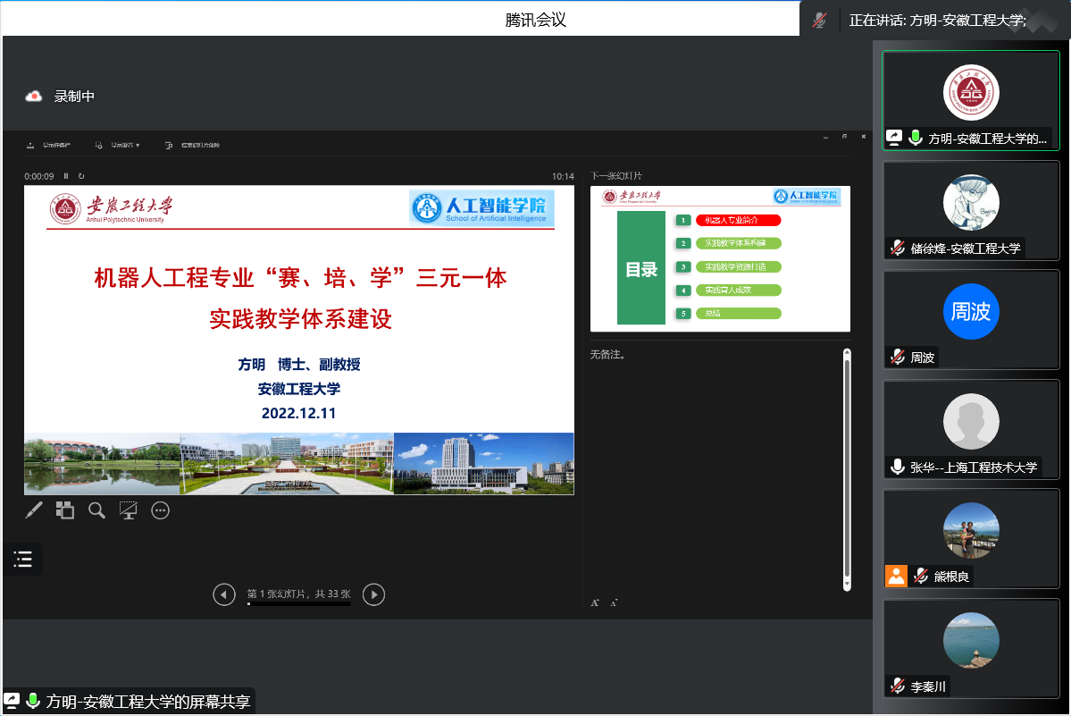 报告中,方明介绍了学校机器人工程专业的建设历程、专业人才培养定位和育人成效,以及依托专业实践资源举办工业机器人应用大赛、机器人技能培训和创新能力训练的探索实践,并以校企联合研制的滚动轴承自动装配及智能检测平台为例,与参会代表交流了产教融合实践模式以及面向工业应用场景培养学生集机械、电气、气动和控制的机器人专业综合能力的具体案例。同时,介绍了我校已连续四届承办的安徽省大学生工业机器人应用大赛相关情况。