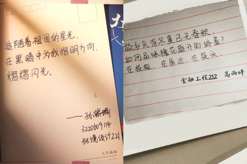 书写能帮助同学们碰触并释放内心最深处的感受,是一种简单易行、科学有效的心理自助技巧。同学们的笔下既有对祖国的热爱、家乡的思念、恋人的爱慕、自我的追寻,也有对星辰大海的向往和对人生的感悟。“追随着祖国的星光,在黑暗中为我指明方向,熠熠闪光。”爱国是中国青年最深沉的情感,奋斗是青年大学生最长情的告白,追随闪耀的星光,在奋斗的道路上筚路蓝缕启山林,栉风沐雨砥砺行。“故乡只有冬夏已无春秋,如何品味槐花盛开的娇羞?在枝桠,在唇边,在筷头。”成长偷走时间,心灵却在归乡的路上,无论何时,家与故乡永远是我们的避风港,是坚强的社会支持,遥遥守望远行的学子。“昏黄的灯光,泛黄的纸张,是你我的锦瑟华年。”青春的懵懂和珍贵就在抬眼间,事过境迁,仍追忆无限。“踱步吟哦透橱窗,雨打芭蕉树影长。舢板晃,山高水远路何方。我以我心过沧浪。”少年不惧岁月长,心向远方自明朗,这种坚定无畏的意志和信念终究能战胜一时的挫折与彷徨。