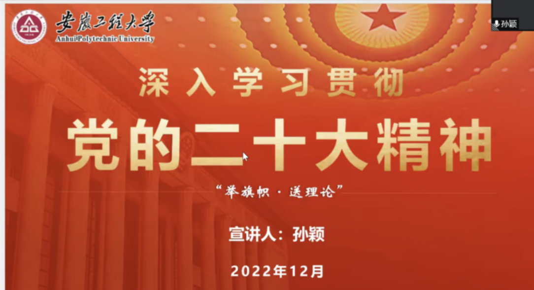 本网讯 12月23日,设计学院通过线上开展了党的二十大精神宣讲。校宣讲团成员、经济与管理学院副教授孙颖主讲。设计学院党委书记胡家增主持,学院党委理论学习中心组成员、教职工、部分学生党员参加。