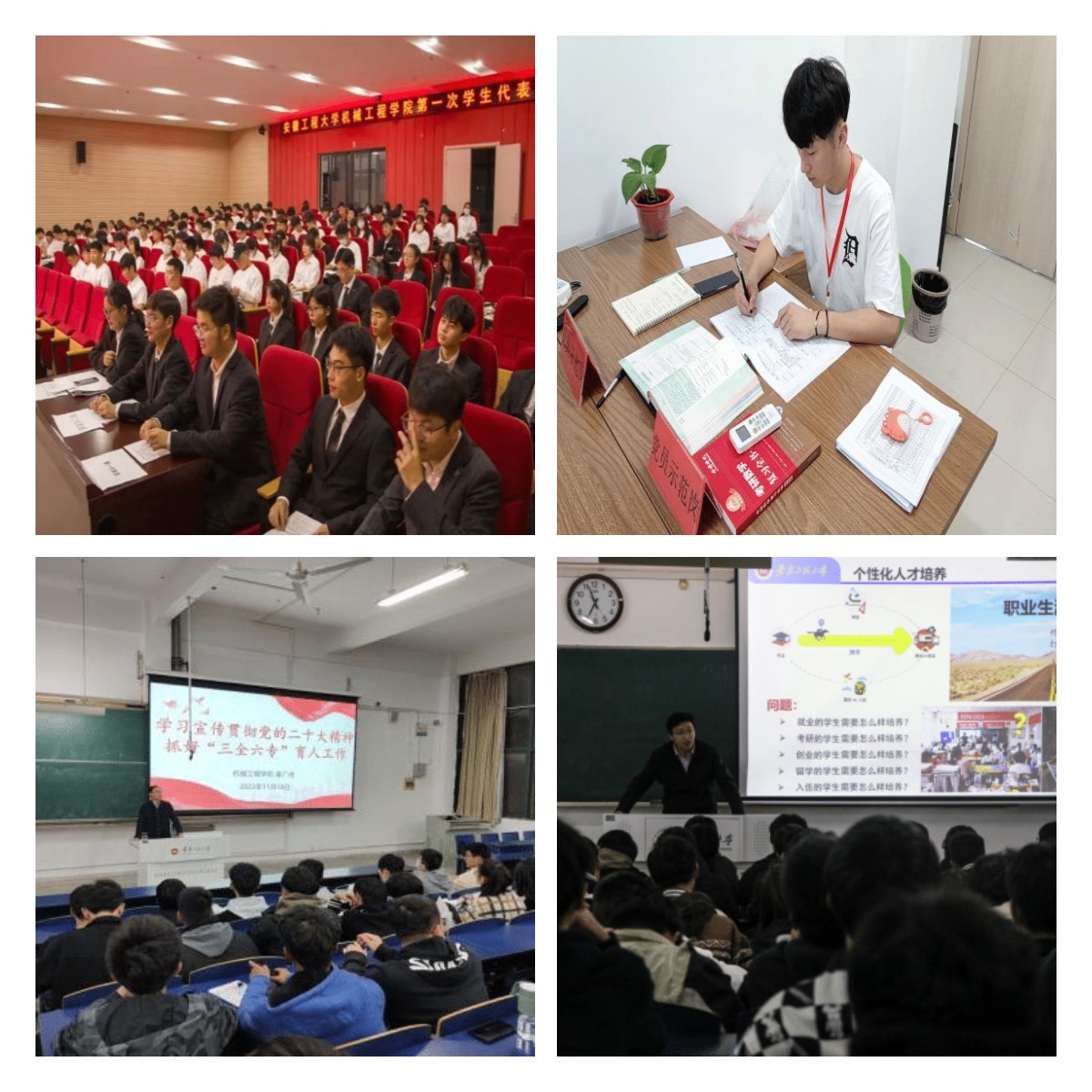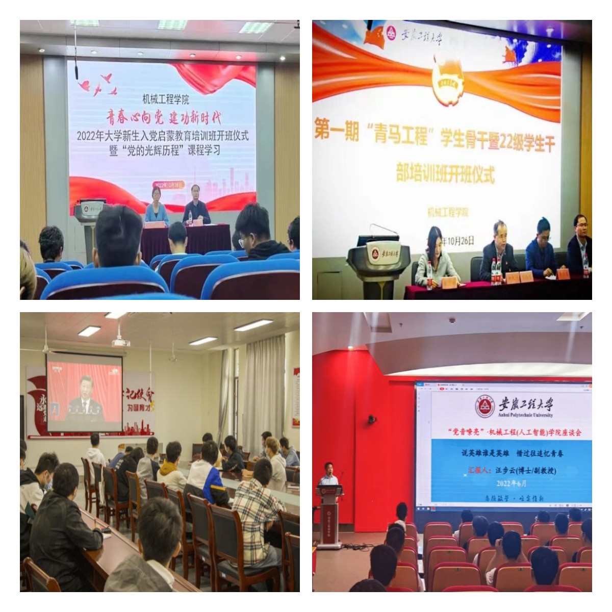 强化“正”引领,筑牢思想根基,坚持做好青年学子的引路人。重点围绕基层党支部创优争先、思政体系建设、党团学一体化建设、网络新媒体平台建设、党员师生先锋模范作用发挥等采取推进措施。强思想引领,重理论武装,开办“入党启蒙教育”培训班、各类分党校培训班、“青马工程”培训班、党员集中学习培训班,培训近2000人次,提交入党申请书1366人;组织开展集中收听收看党的二十大开幕会、“学习宣传贯彻党的二十大 我为申博做贡献”“强国有我请党放心”“喜迎党的二十大,奋斗新征程”“学习党的二十大 党课正开讲”等党的二十大系列主题活动;举办资助诚信教育主题活动、《学生手册》知识竞赛、“抗击疫情,党员先行”实践活动;召开第一届学生代表大会;依托学院团委微信公众号开设“青年说”“青年微榜样”“青年分享”“感‘械’研途”等系列推文栏目,强化榜样引领作用,筑牢网络新阵地;举办以“青春厚植信仰,绽放绚烂之花”“说英雄谁是英雄,昔过往追忆青春”为主题的“党音嘹亮”大讲堂品牌讲座2场;邀请离退休老教师赵国庆做“十万里红色骑行 学党史致敬经典”专题报告。继续强化研究生工作室“红色读书角”建设,共同品读红色经典书籍。做到理论学习全覆盖、政策宣传全覆盖、行动实践全覆盖。机械182李增产荣获“中国大学生自强之星”奖学金,机制205朱哲枭荣获2022年安徽省大学生年度人物提名荣誉称号,机电201张晨荣获“外研社·国才杯”全国英语演讲、阅读、写作大赛(安徽赛区)一等奖,机械20级研究生杨克帆荣获省级研究生“党员标兵”荣誉称号。