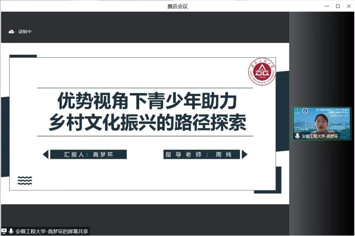 本网讯 1月11日至12日,由中国社会工作教育协会主办、重庆工商大学承办的第十四届中国社会工作大学生论坛暨第七届研究生论坛在线上举行。本次论坛共吸引了300多名社会工作专业专科生、本科生、硕士以及博士研究生积极投稿参会,围绕“新时代中国社会工作高质量发展的实践与经验”论坛主题,从社会工作参与乡村振兴、第三次分配、共同富裕、社区治理、乡镇(街道)社会工作站建设等方面展开深入交流与探讨。经推荐选拔,人文学院社会工作21级硕士研究生祝巍铖、高梦环两位同学成功入围,并在大会上做主题发言。
