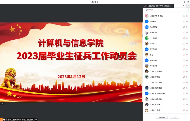 本网讯 青春意气风发,从戎无上光荣。为进一步鼓励学院2023届毕业生参军入伍,1月12日晚,计算机与信息学院线上召开2023届毕业生征兵工作动员会。学院党委副书记孙德茹,2023届毕业班辅导员、院征兵负责人、毕业生及家长参会,动员会特别邀请校征兵工作站赵成婧进行专业政策解读。