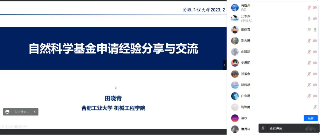 本网讯 为持续推进人工智能学院2023年国家自然科学基金申报工作,进一步提升基金申报书撰写质量,2月2日下午,人工智能学院举行了专题辅导交流会,特邀请合肥工业大学博士生导师田晓青教授在线指导,学院与会老师交流各自申报书撰写情况,会议由学院副院长江本赤主持。