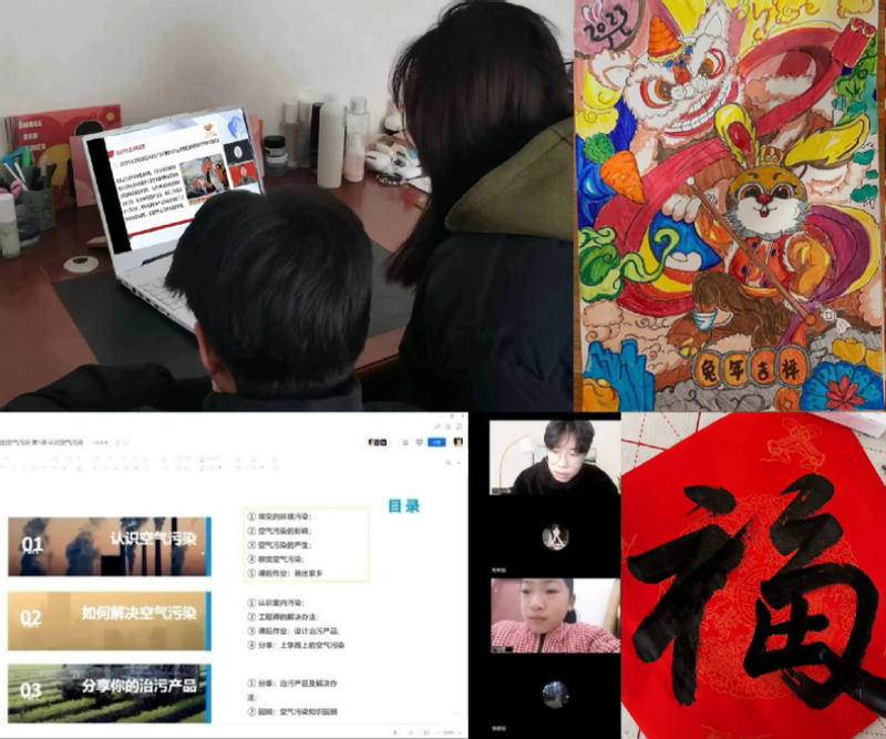 学院星火义务支教社与贵州省黔南布依族苗族自治州三都水族自治县第三小学达成对接,在寒假期间通过线上对接的方式开展义务支教活动。120名青年志愿者围绕“一起快乐阅读”“一起健康运动”“一起云课堂”等板块,向106名结对儿童介绍家乡特色、讲解历史故事、共读一本书,共同开展思政、环保、美育、健康等主题的“云课堂”活动,完成了一系列“奋进新征程”美术绘画作品,累计开展支教志愿服务时长约900小时。