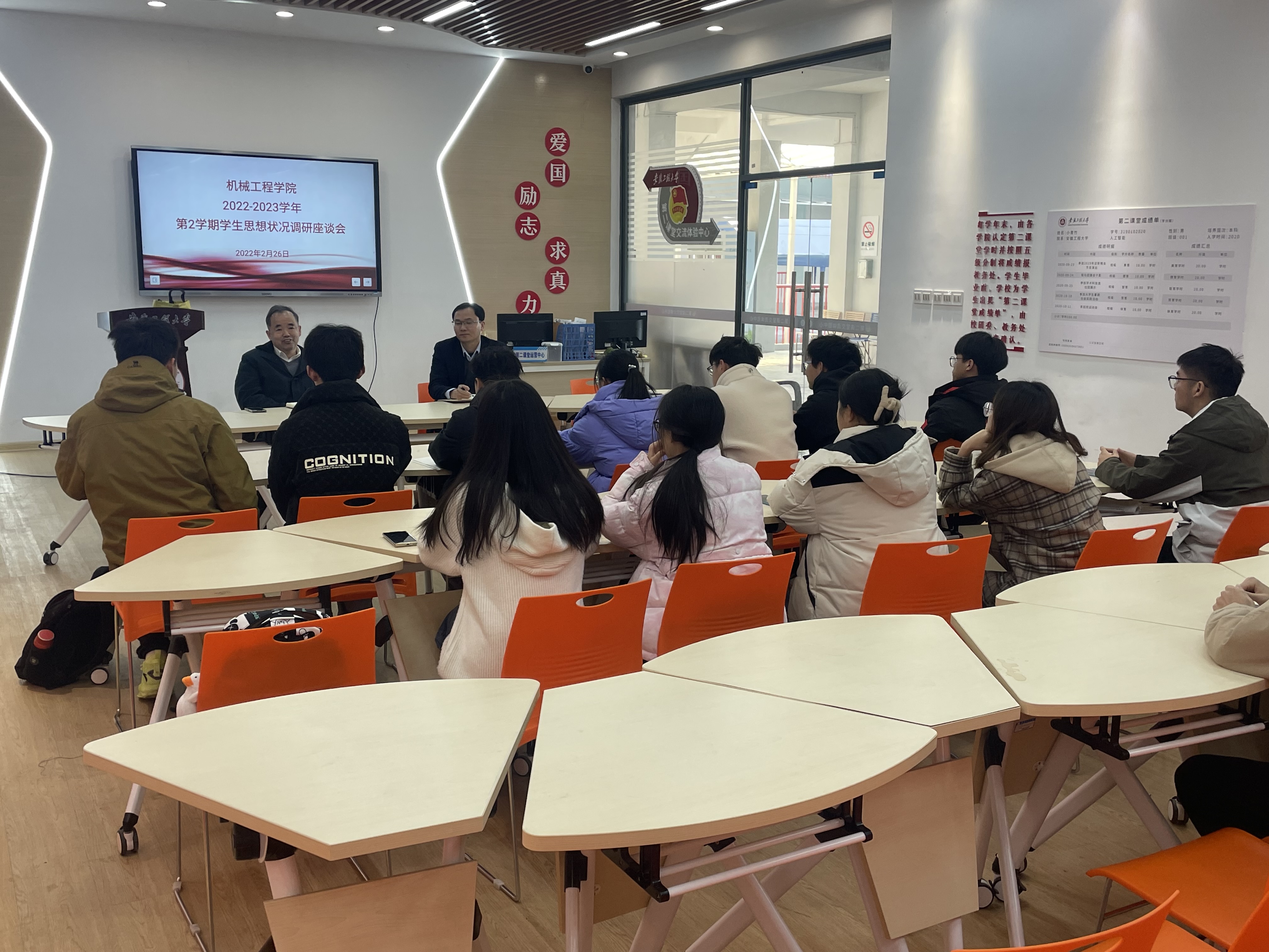 本网讯 为深入了解新学期学生思想动态,不断推进“三全六专”育人工作,2月26日,机械工程学院组织召开新学期学生思想动态调研座谈会,学院党政领导班子成员、相关辅导员老师、各年级本科生及研究生代表参会。座谈会分别由秦广虎、潘家保两位老师主持。