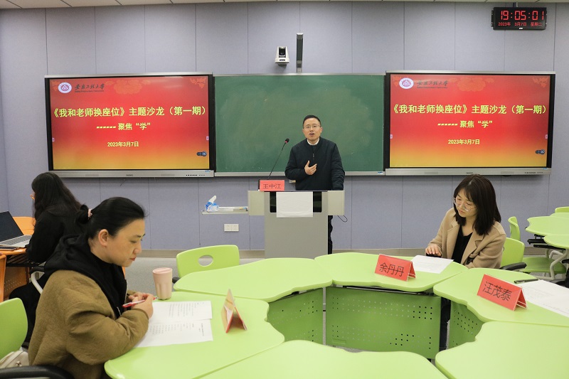 本网讯 为贯彻落实学校“三全六专”工作要求,聚焦让学生 “学”起来,查找并分析影响优良学风形成的主要问题和原因,梳理解决对策,紧盯提升学风的实际成效,人文学院于3月7日晚在4教112举办《我与老师换座位》头脑风暴主题沙龙第一期活动,人文学院教师代表蒋艳、汪茂泰、余丹丹,一至三年级30名本科生代表参加活动。活动由人文学院党委副书记王中江主持。