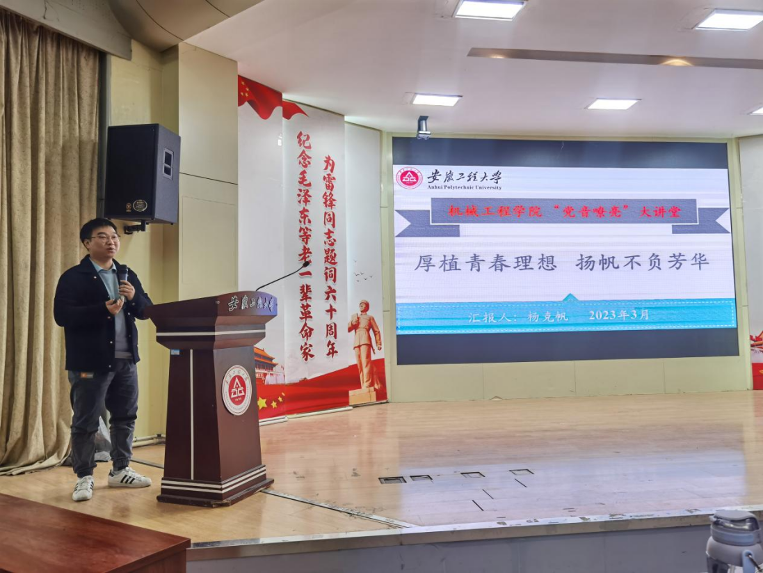 本网讯 为充分发挥学生党员在朋辈教育中的示范引领作用,推进学院“三全六专”育人工作,近日,机械工程学院“党音嘹亮”大讲堂之“厚植青春理想,扬帆不负芳华”专题讲座在学术报告厅举行。本期主讲嘉宾为青年学生党员代表、入围第十七届“全国大学生年度人物”的朱哲枭同学和2022年度安徽省研究生“党员标兵”荣誉称号获得者杨克帆同学。学院党委副书记秦广虎、2022级递交入党申请书的学生骨干100余人参会。讲座由时慕天老师主持。