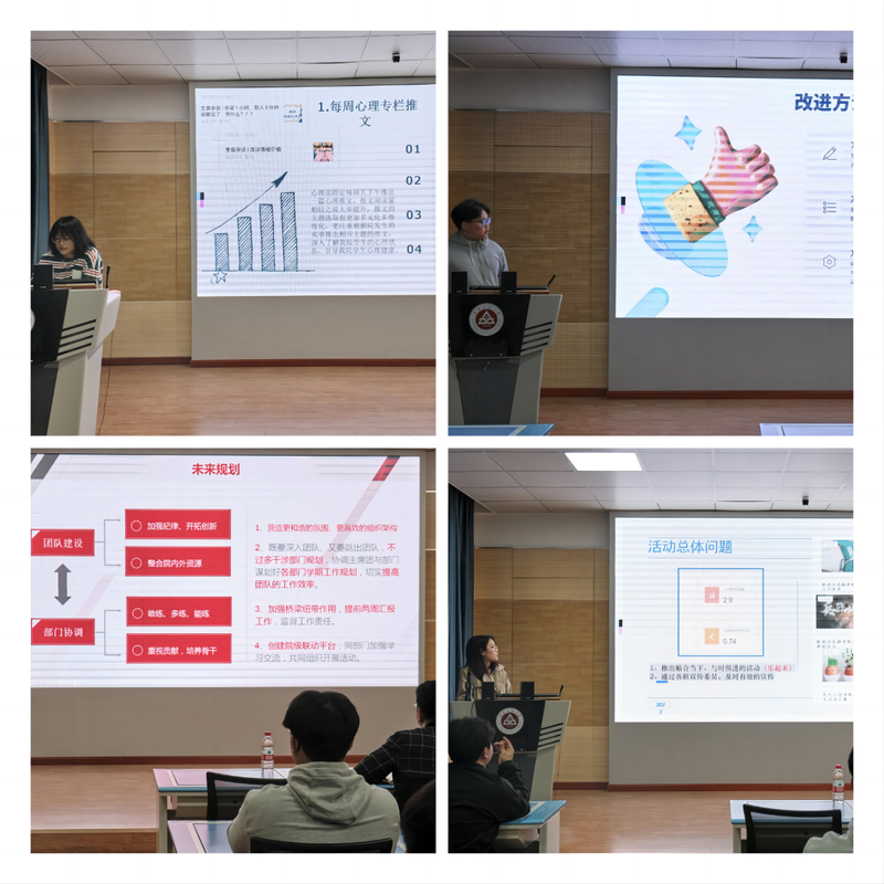 会上,各部门及主席团就2022-2023学年度第一学期活动的开展情况,进行总结汇报,针对本学期工作开展做出具体规划和建议;与会老师对其述职进行评议,肯定取得的成绩同时,也指出后进不足的地方,并提出改进建议。团委负责老师希望大家,增强责任感与使命感、练就过硬本领,树立学生干部形象,努力创新突破,切实发挥学生组织的时效作用,续写团学工作的新篇章。